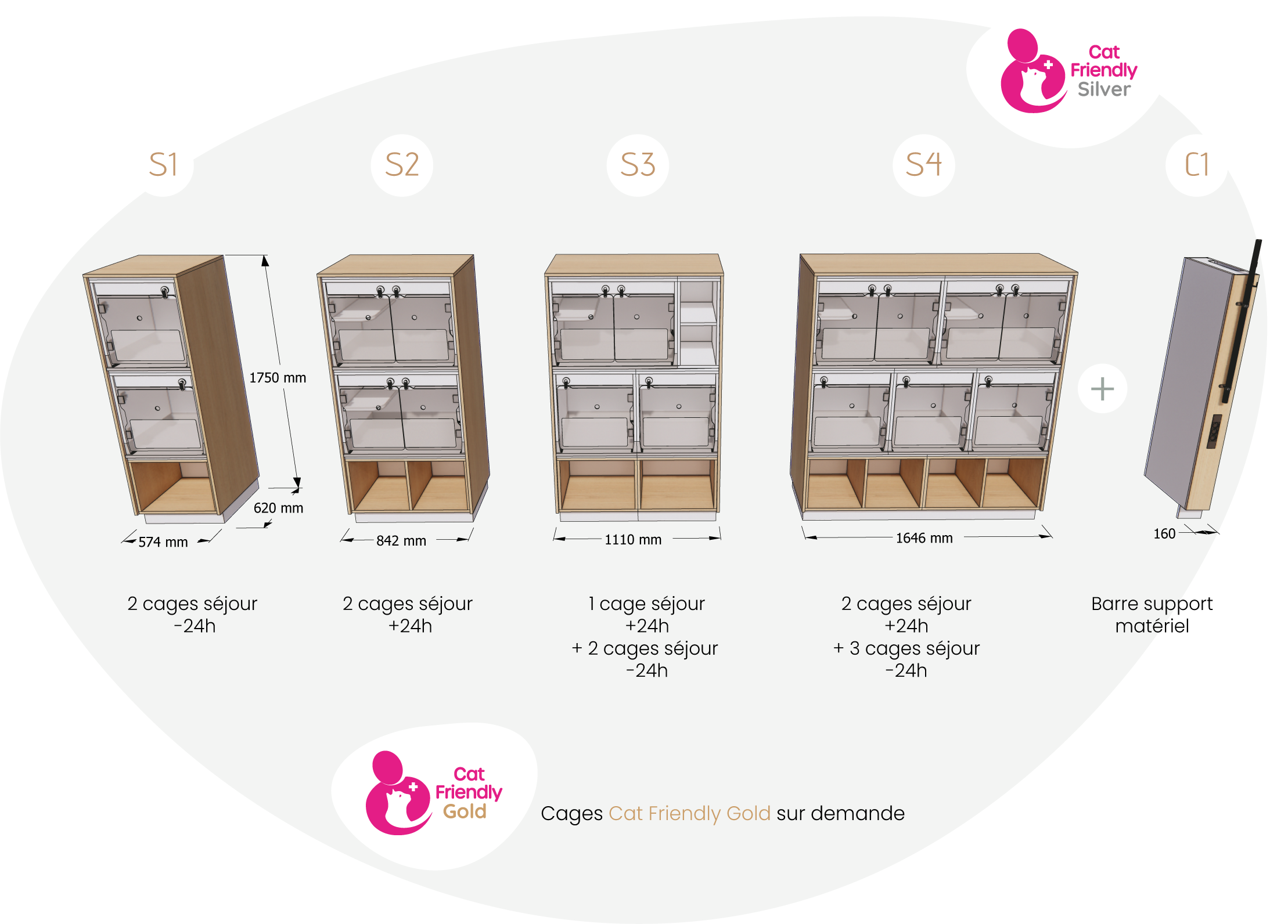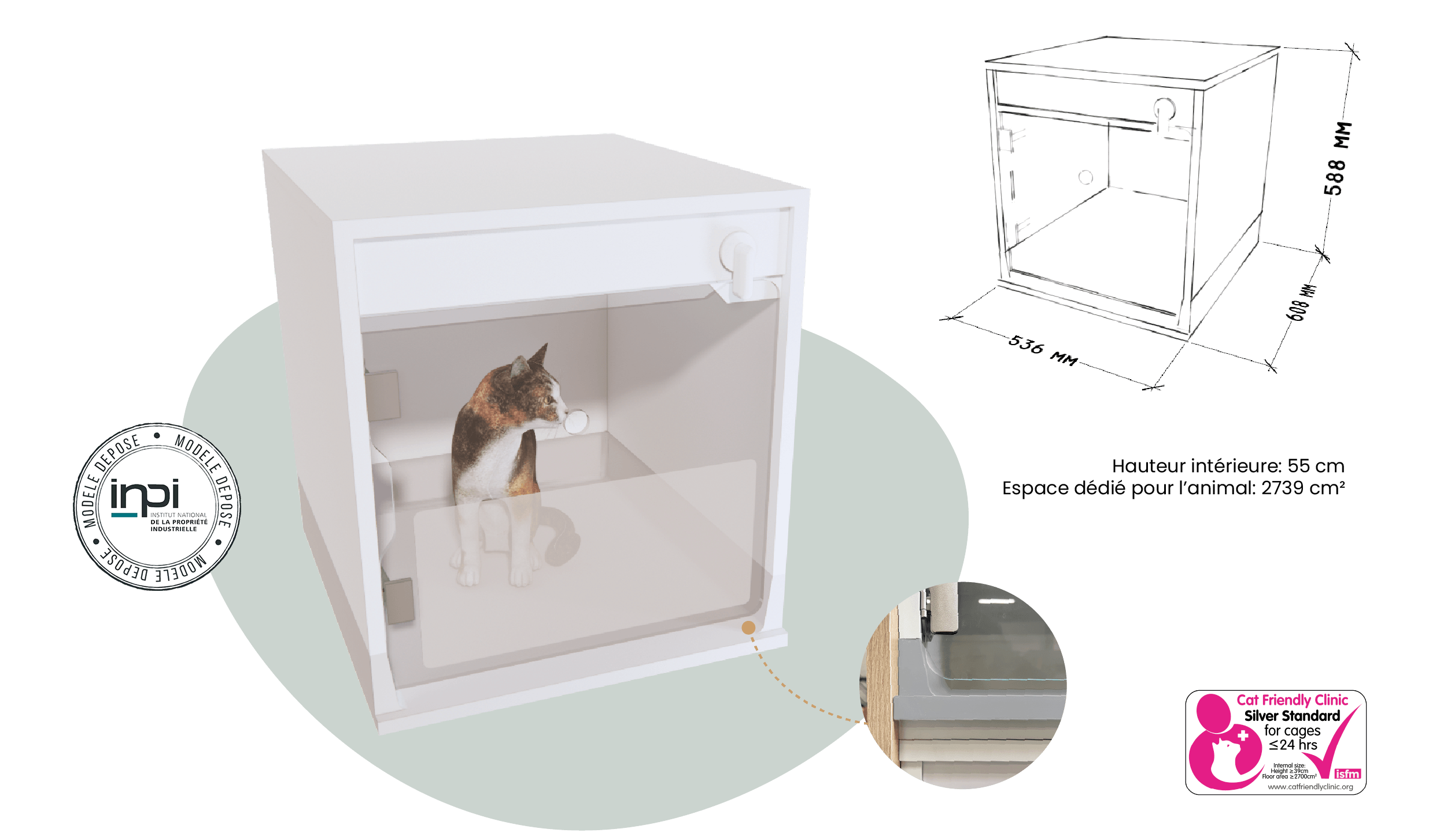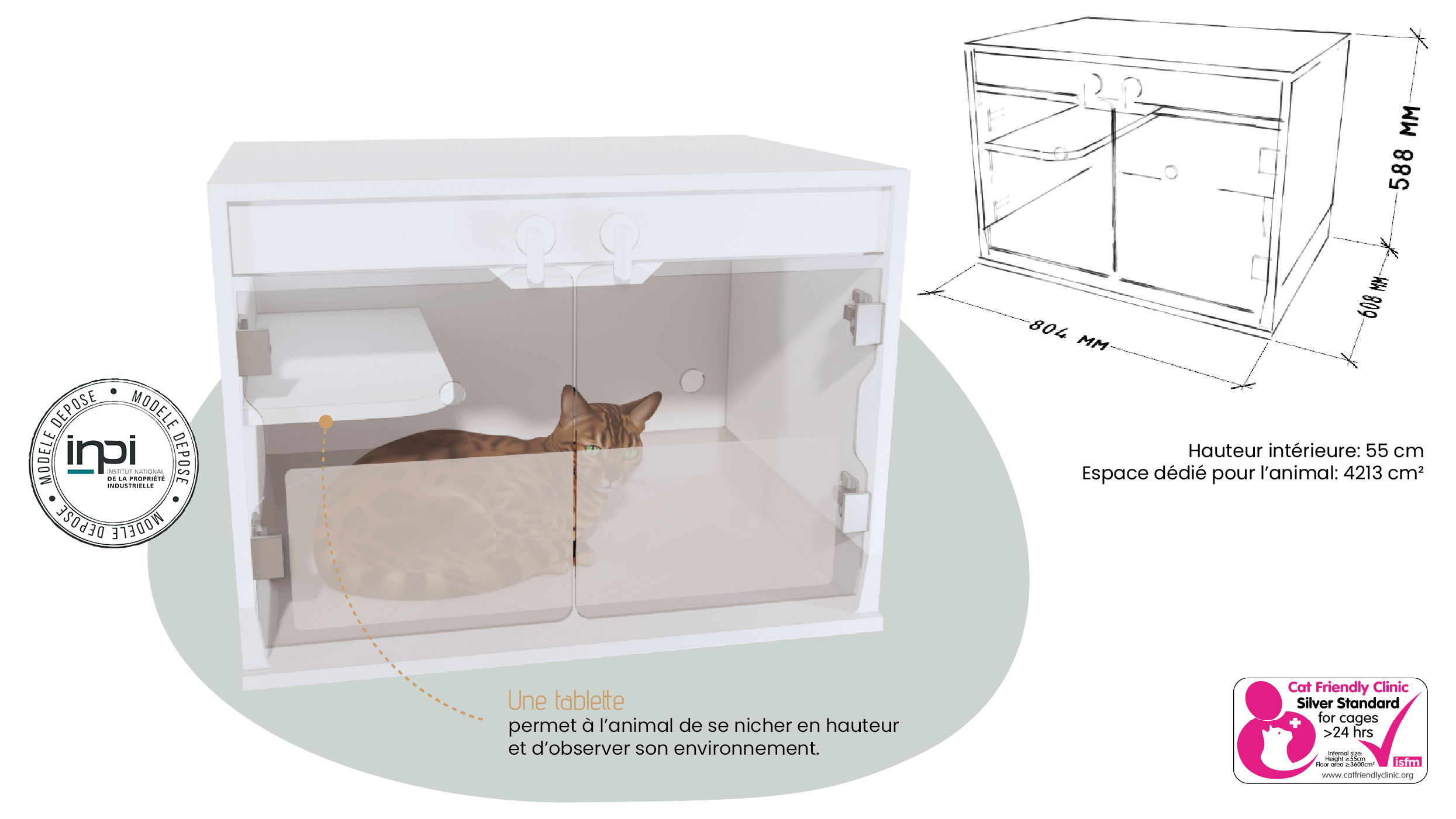 Nos cages sont conçues selon les dimensions recommandées par le label Cat Friendly, garantissant confort et bien-être pour les animaux.