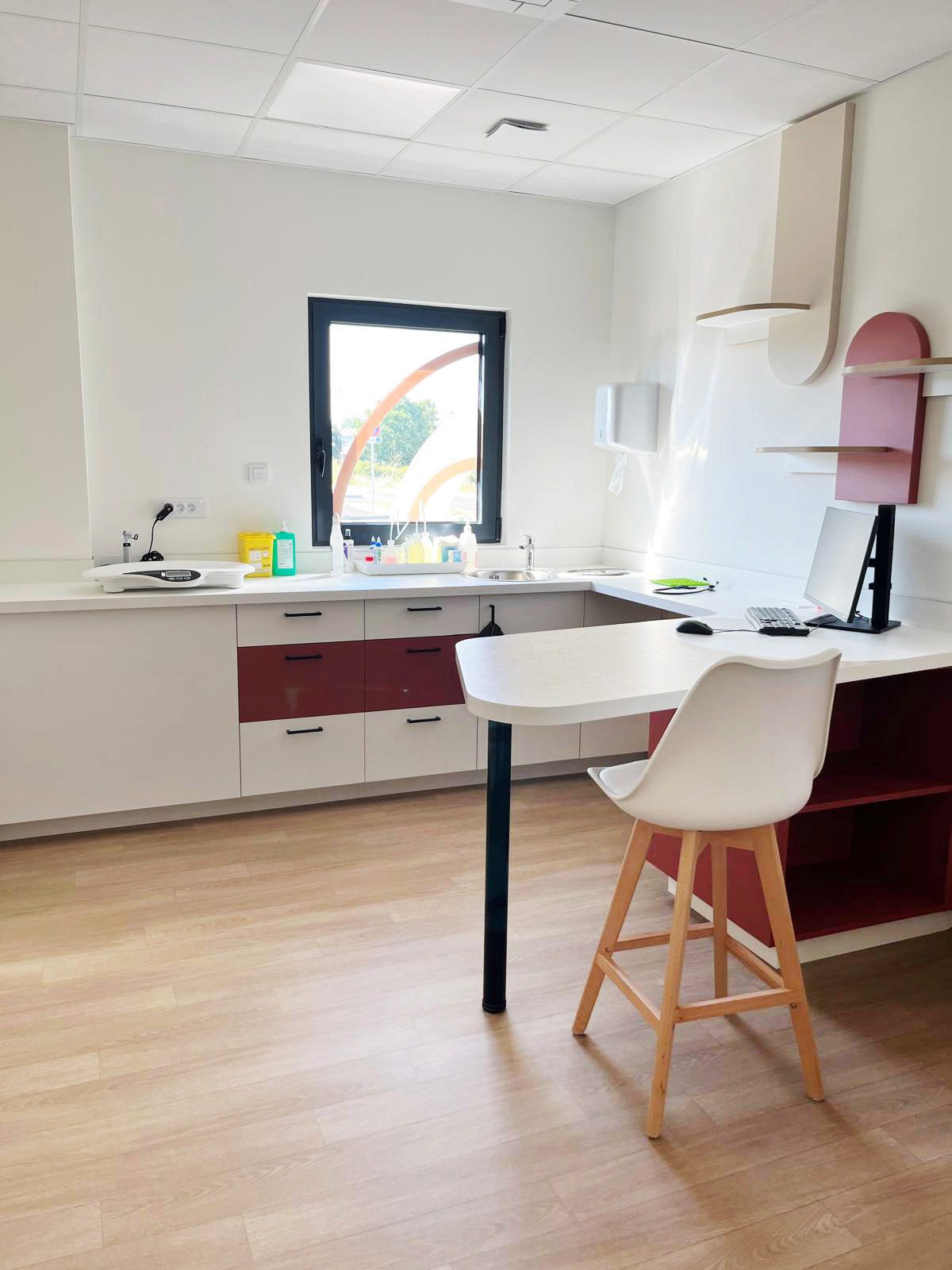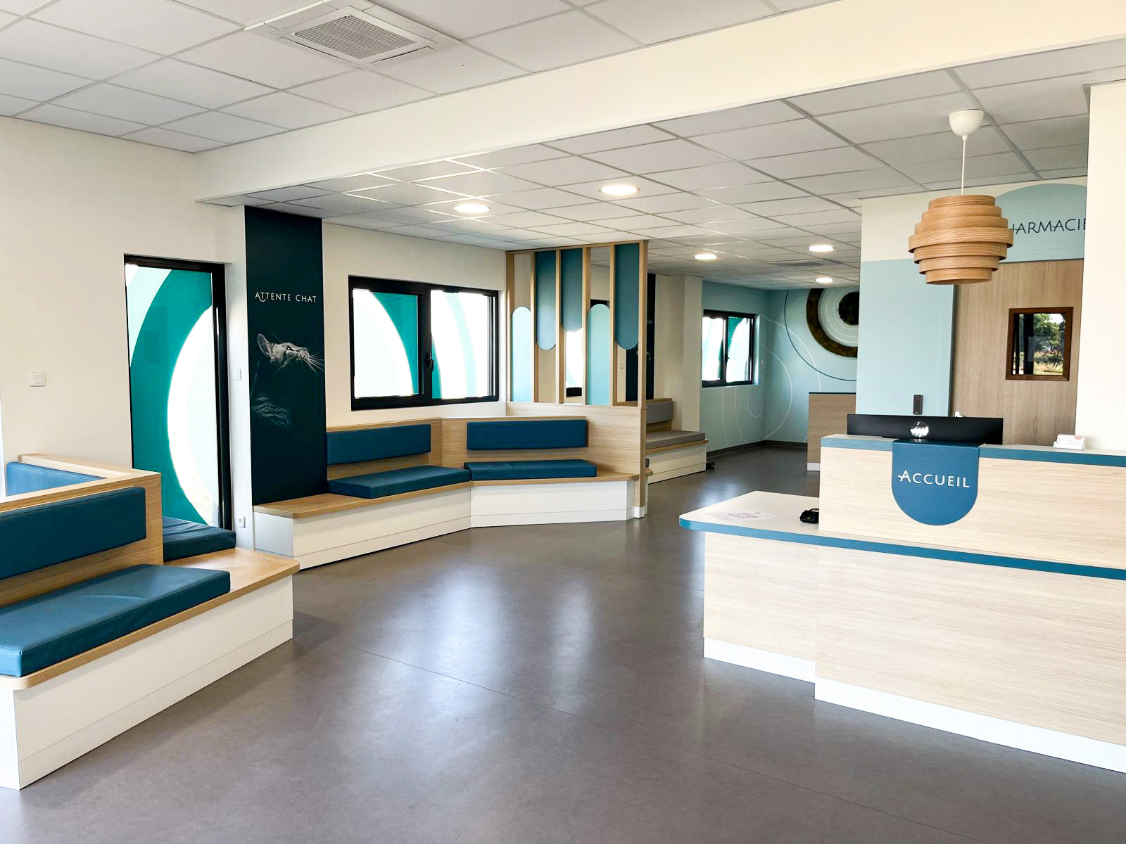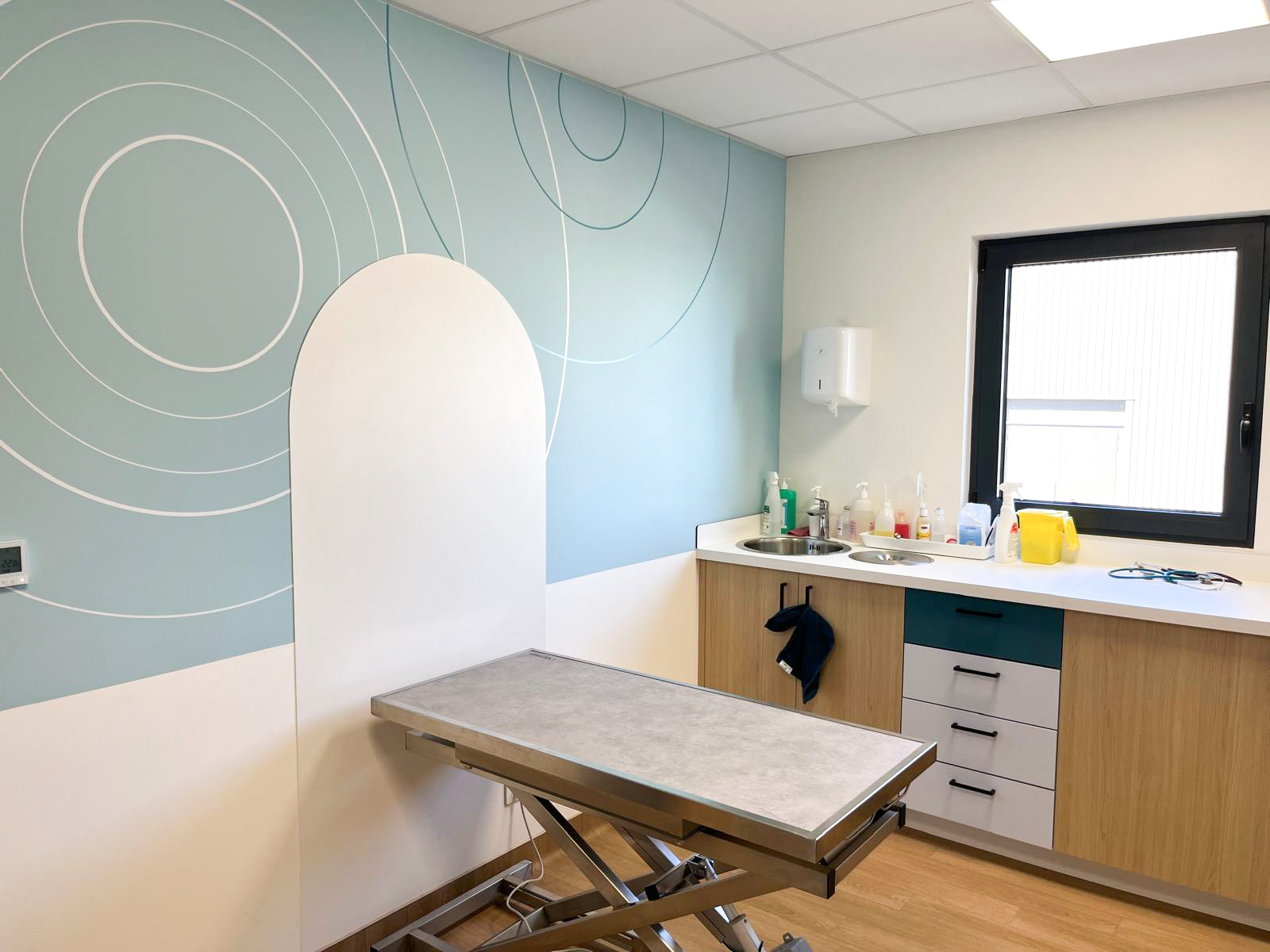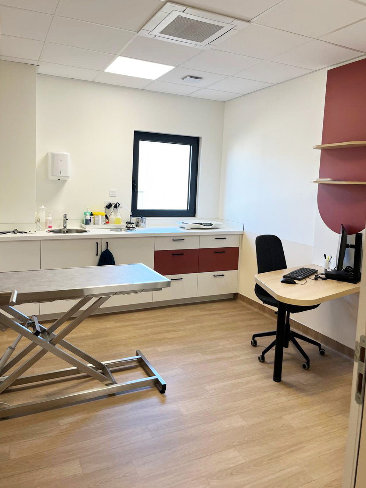Nous avons accompagné les équipes de la clinique vétérinaire Vet’Auréa de Dole (39) dans la création de leurs nouveaux espaces de travail, depuis la conception de l’agencement jusqu’à la fabrication et la pose. Structurée en trois pôles, « petits animaux », « grands animaux » et « urgences », la clinique a bénéficié d’un aménagement pensé pour optimiser la circulation entre les différents services, tout en offrant un accueil plus fluide et apaisant pour les animaux et leurs propriétaires. Les espaces techniques ont été soigneusement conçus pour offrir un environnement de travail fonctionnel et ergonomique aux équipes, contribuant ainsi à améliorer la qualité des soins prodigués au quotidien.